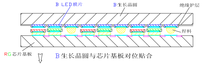 完成R LED膜片以及G LED膜片轉(zhuǎn)移得到的RG芯片基板,再與B生長(zhǎng)晶圓對(duì)位貼合,進(jìn)行B LED膜片的晶圓級(jí)規(guī)模轉(zhuǎn)移,得到RGB芯片基板。