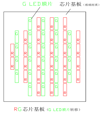 完成R LED膜片轉(zhuǎn)移的芯片基板,再與G生長(zhǎng)晶圓對(duì)位貼合,進(jìn)行G LED膜片的晶圓級(jí)規(guī)模轉(zhuǎn)移,得到RG芯片基板。