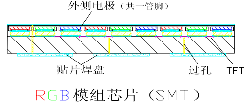 外側(cè)電極通過(guò)側(cè)壁引線與貼片焊盤導(dǎo)通,外側(cè)電極共一貼片焊盤,薄膜晶體管(TFT)驅(qū)動(dòng)電路通過(guò)過(guò)孔與貼片焊盤導(dǎo)通。