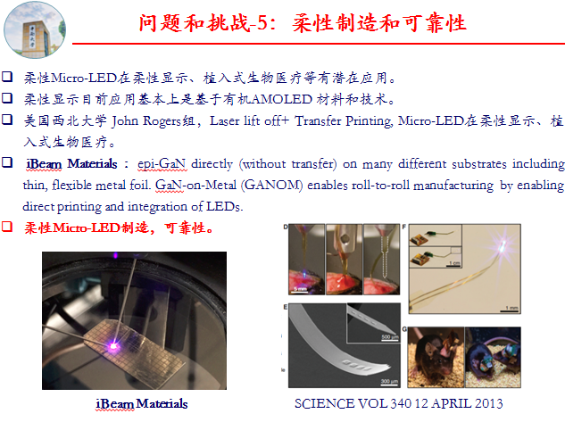 柔性Micro LED在柔性顯示、植入式生物醫(yī)療等有潛在應(yīng)用。柔性顯示目前應(yīng)用基本上是基于有機(jī)AMOLED材料和技術(shù)。美國(guó)西北大學(xué)John Rogers組,通過Laser lift off和Transfer Printing, 將Micro LED在柔性顯示、植入式生物醫(yī)療。但是正如在巨量轉(zhuǎn)移技術(shù)中討論的,需要將GaN/襯底界面先底切蝕刻,才能實(shí)行轉(zhuǎn)印。而GaN/襯底界面是比較難以蝕刻的,這增加了柔性制造和轉(zhuǎn)移的困難以及可靠性,成功率和工藝復(fù)雜性。iBeam Materials公司報(bào)道了基于金屬薄膜襯底的直接外延生長(zhǎng)(GaN-on-Metal),制造柔性LED。但是并無更多的相關(guān)LED質(zhì)量,良率等方面的繼續(xù)報(bào)道??傊嵝訪ED和Micro存在制造工藝復(fù)雜性、可靠性、效率和良率等問題。