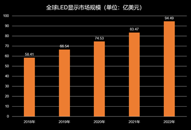 小間距LED品類增多,并開始與DLP和LCD競爭室內顯示市場。從全球LED顯示市場規(guī)模的數據上顯示,2018年到2022年,小間距LED顯示產品性能優(yōu)勢明顯,形成對傳統(tǒng)LCD、DLP技術的替代趨勢。