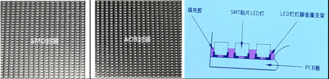 AOB是表貼模組底部覆膠技術,也是在傳統(tǒng)SMD小間距模組燈珠間隙里封裝半層透明膠體,解決防護性問題,其本質上還是SMD小間距產品,存在局限與潛在風險,例如難以做到P1.25以下間距,只能用TOP燈珠,表貼工藝的潛在問題仍然存在等。