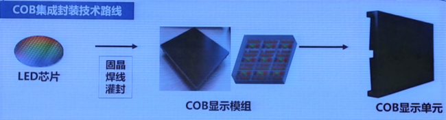 COB工藝是直接將LED芯片用導電或非導電膠粘附在PCB基本上,進行引線鍵合實現電氣連接(正裝工藝)或采用芯片倒裝技術(無需金屬線)使燈珠正負極直接與PCB連接(倒裝工藝),最后形成顯示單元模組,再將模組安裝在固定箱體上,配以電源、控制卡及線材等形成led顯示屏成品。COB技術其優(yōu)點在于簡化了生產流程,降低了產品成本,功耗降低因此顯示表面溫度降低,對比度大幅提升,其缺點在于可靠性面臨更大挑戰(zhàn),修燈困難,亮度、顏色、墨色還難做到一致性。