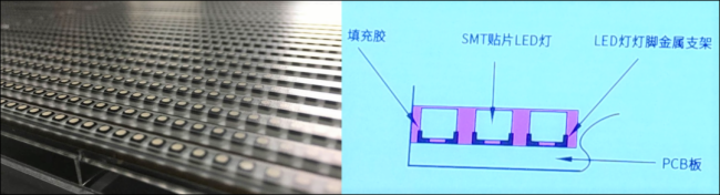GOB是表貼模組整體表面覆膠技術,是在傳統(tǒng)SMD小間距模組表面封裝一層透明膠體,解決強狀性及防護性,本質上還是SMD小間距產品,其優(yōu)勢在于降低了死燈率,增加了燈珠的防磕碰強度和表面防護性,其缺點在于難以修燈,膠體應力導致的模組變形,反光,局部脫膠、膠體變色,虛焊難以修復等特點。