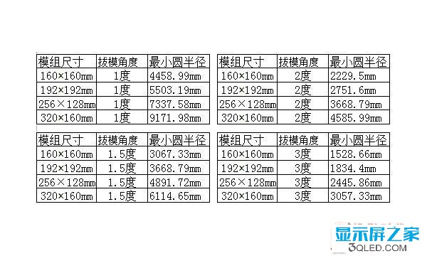 以下是市面上最常見的led顯示屏模組規(guī)格和常見的底殼拔模角度(1、1.5、2、3度)以及它們可形成的圓弧的最小半徑:eFuLED顯示屏廠家|江蘇迷你光電有限公司