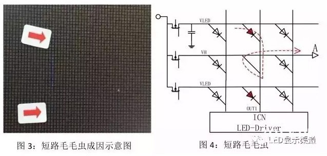 當(dāng)LED短路時(shí),會(huì)出現(xiàn)一列長(zhǎng)亮現(xiàn)象,一般稱為短路毛毛蟲。當(dāng)中間LED燈珠短路時(shí),同列的LED燈珠在掃描到該行時(shí)會(huì)形成如下圖所示通路,在VLED到A點(diǎn)之間如果壓差大于LED燈珠點(diǎn)亮值,則會(huì)形成一列常亮毛毛蟲。DaRLED顯示屏廠家|江蘇迷你光電有限公司