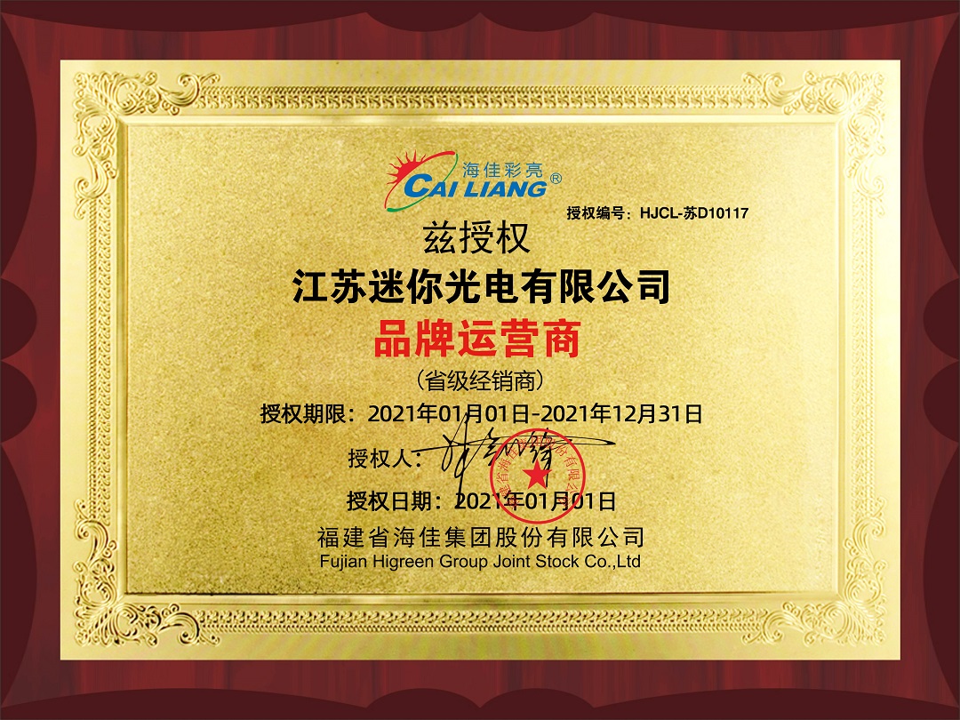 2021年1月江蘇迷你光電有限公司受邀攜手簽約福建海佳集團(tuán)有限公司(簡(jiǎn)稱海佳彩亮,海佳集團(tuán))江蘇省級(jí)代理商!