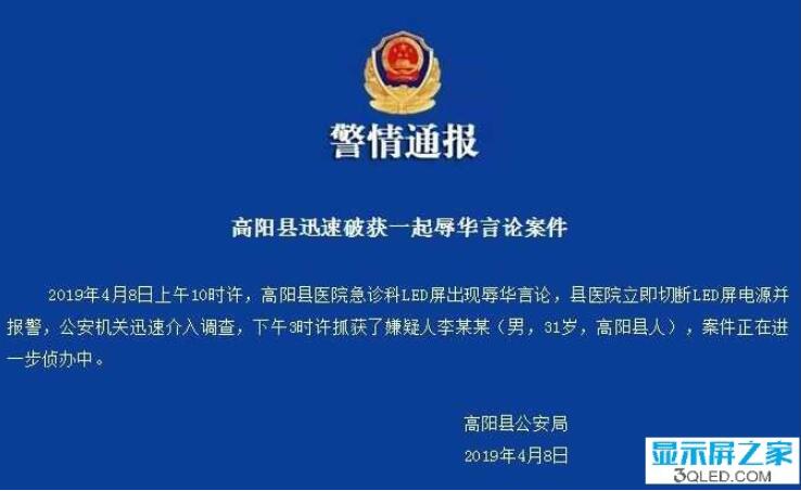高陽縣公安局4月8日通過微信公號“保定晚報(bào)”通告稱,8日上午10時(shí)許,高陽縣醫(yī)院急診科led屏出現(xiàn)辱華言論,縣醫(yī)院立即切斷led屏電源并報(bào)警,公安機(jī)關(guān)迅速介入調(diào)查,下午3時(shí)許抓獲了嫌疑人李某某(男,31歲,高陽縣人),案件正在進(jìn)一步偵辦中。F5hLED顯示屏廠家|江蘇迷你光電有限公司