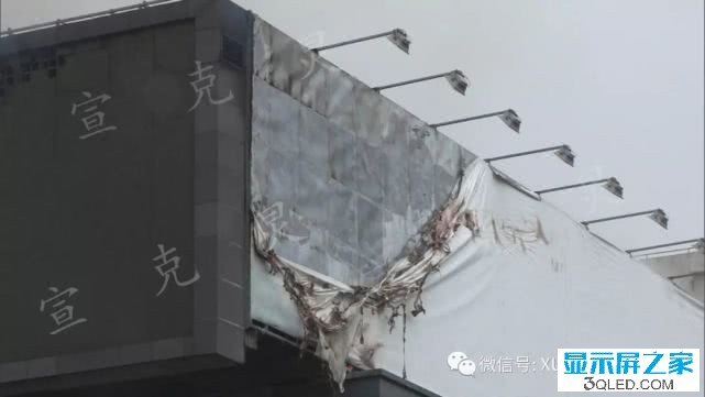 記者注意到:這塊LED大屏已經(jīng)被燒裂開(kāi)來(lái),表面的一塊塊方塊有一些已經(jīng)被燒融,大部分被熏黑燒焦。