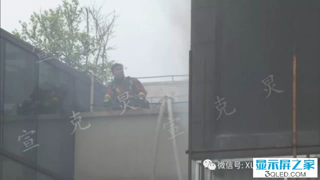 明火直躥半空中,火勢(shì)已經(jīng)從LED大屏朝內(nèi)部蔓延,也有消防隊(duì)員已經(jīng)上到高樓上展開(kāi)內(nèi)攻滅火。