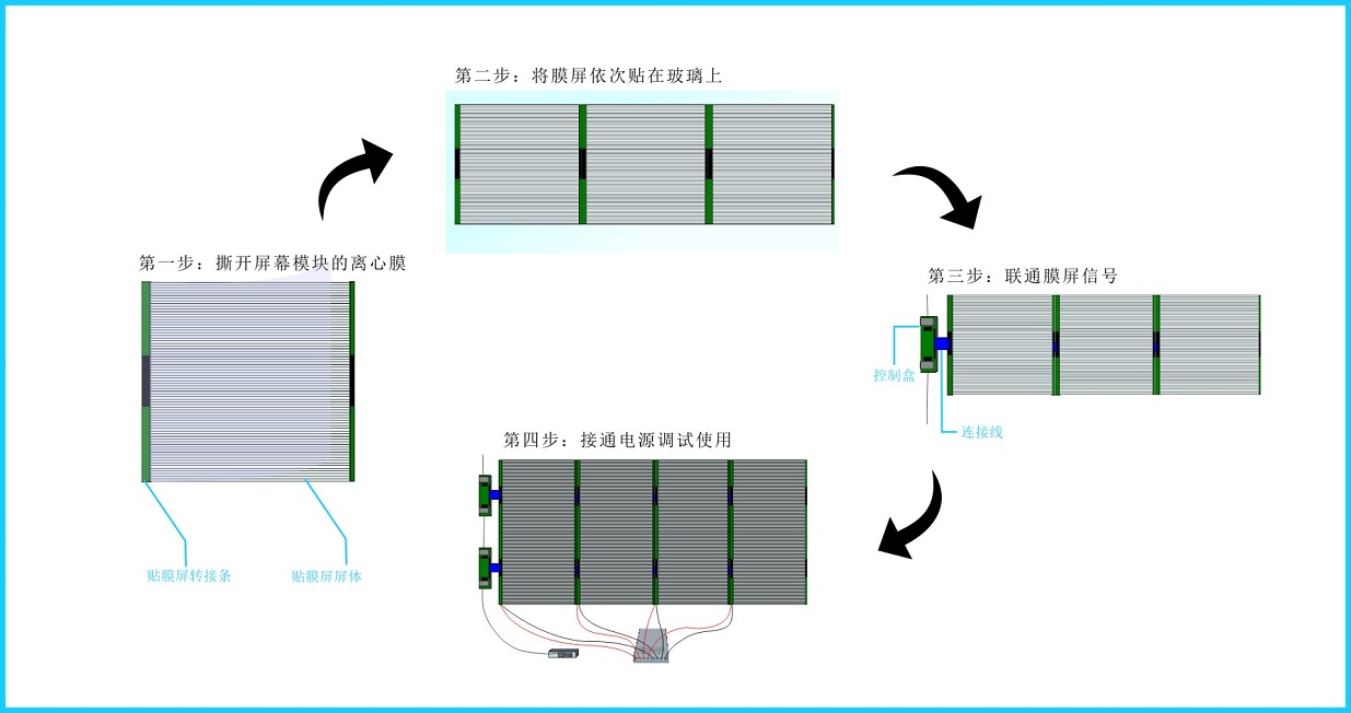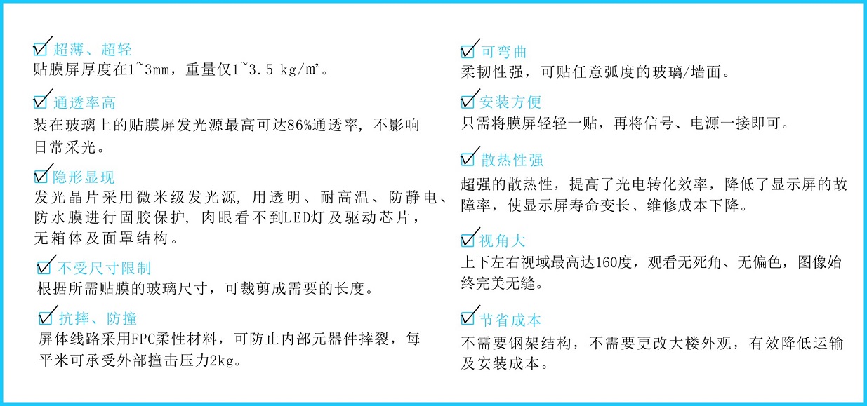 led顯示屏的高端產(chǎn)品。輕、薄、透明、安裝簡單是顯示屏的大趨勢,迷你光電研發(fā)出品的貼膜屏,致力于滿足全球LED貼膜的需求,采用我司特定裸芯片,將元器件固裝在高透的PCB板材上,通過特有的蓋膠工藝,使顯示模塊整合成一款厚度最小是1~3mm的高透可發(fā)光顯示的高透光學(xué)透鏡式基板。
